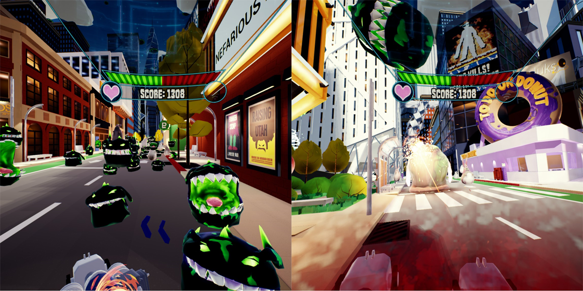 The graphics and atmosphere only add to Hangry Bunnies. Although future L.A. is the only environment available, it looks stunning. Lighting and textures feel properly cartoony, and the colors are bright and popping. Animations look slimey and trippy, fitting with the “gross alien” theme. In game, these polished visuals look good and run very well. Strangely, though, the main menu lags like crazy- although this evidently isn’t a problem for the actual gameplay. The user interface generally works fine and suffers from no notable issues, though it would be nice to have graphics options beyond the present “setting: low or high graphics?”